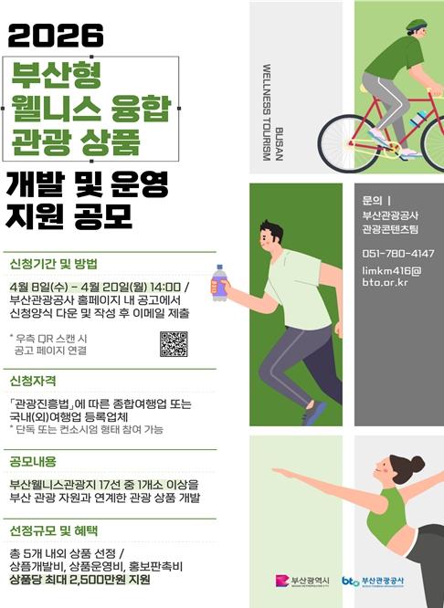 부산시와 부산관광공사는 부산 웰니스 관광자원을 활용한 융합 관광상품 개발과 글로벌 시장 진출을 지원하기 위해 '부산형 웰니스 융합 관광상품 개발 및 운영 지원' 공모를 오는 4월 20일까지 실시한다고 밝혔다.