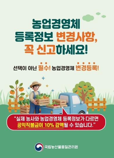 특히, 올해부터는 농업경영체 등록정보 변경 의무를 이행하지 않은 경우 공익직불금 10%를 감액할 방침이므로 농업인의 각별한 주의가 필요하다.
